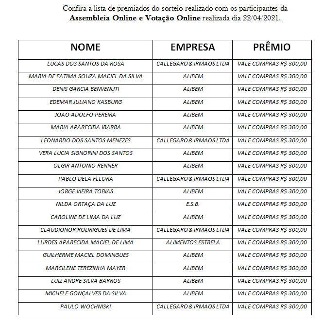 Para os ganhadores residentes de São Luiz Gonzaga, estes deverão se dirigir até a sub sede no decorrer da próxima semana para retirar seu prêmio.